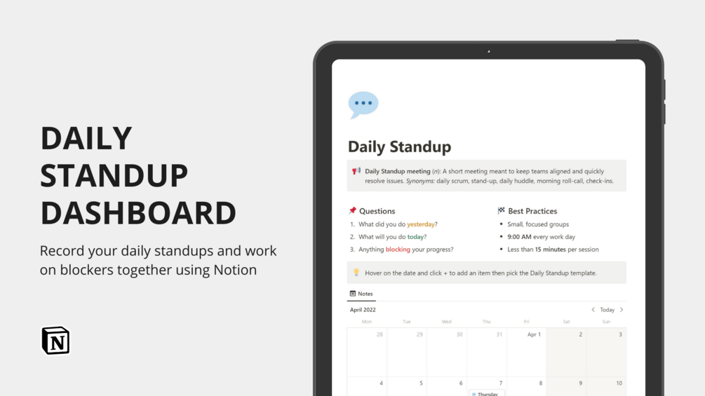 This template lets you easily record your standup notes, work on any blockers that arise, and assign who is responsible for resolving them.